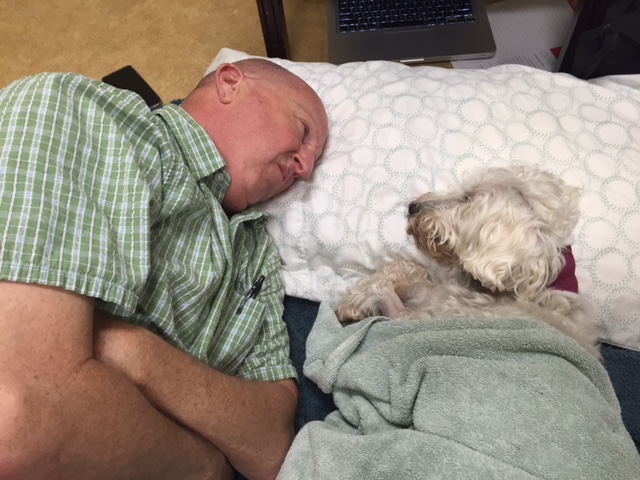 He came back inside and took a nap between Russ and me for about an hour. Deep sleep. Protected by his people sleep. He drank a little water and got to skip rounds today and stay with us longer. They said he had been up at about 4:00 this morning when they had an admission. He was circling in his kennel and kept getting tangled. Bless him.